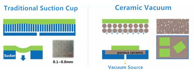 Perinteisillä metalliistukkailla on epätasainen imuvoima, ne ovat alttiita muodonmuutoksille ohuissa materiaaleissa, niiltä puuttuu antistaattiset ominaisuudet ja ne ovat alttiita kulumiselle alhaisen kovuutensa vuoksi. Keraamiset alipaineistukat puolestaan soveltuvat ohuille osille, tarjoavat antistaattisia ominaisuuksia ja ovat kulutusta ja korroosionkestäviä.