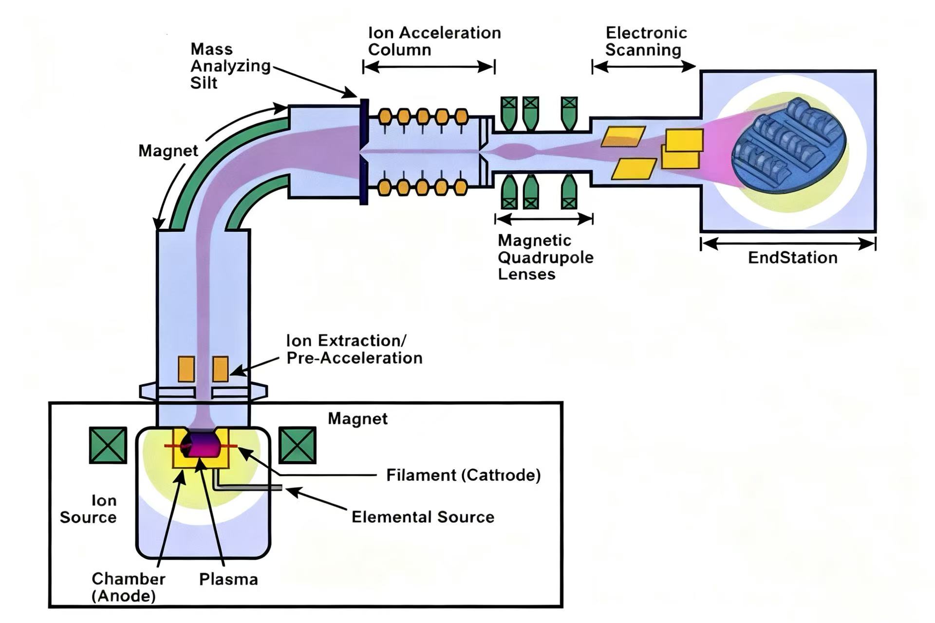 2. Ioni-istutus on ensisijainen dopingtekniikka puolijohteiden valmistuksessa, jolla on useita etuja, kuten korkea seostustarkkuus, alhaiset prosessilämpötilat ja vähäinen vaurio substraattimateriaalille. Tarkemmin sanottuna ionin istutusprosessi edellyttää epäpuhtausatomien ionisoimista varautuneiden ionien luomiseksi, minkä jälkeen näiden ionien kiihdyttäminen korkean intensiteetin sähkökentän kautta muodostaa korkean energian ionisäteen. Sitten nämä nopeasti liikkuvat ionit iskevät puolijohteen pintaan, mikä mahdollistaa tarkan implantoinnin säädettävällä seostussyvyydellä. Tämä tekniikka on erityisen hyödyllinen luotaessa matalia liitosrakenteita, kuten MOSFETien lähde- ja valuma-alueita, ja mahdollistaa erittäin tarkan epäpuhtauksien jakautumisen ja pitoisuuden hallinnan.