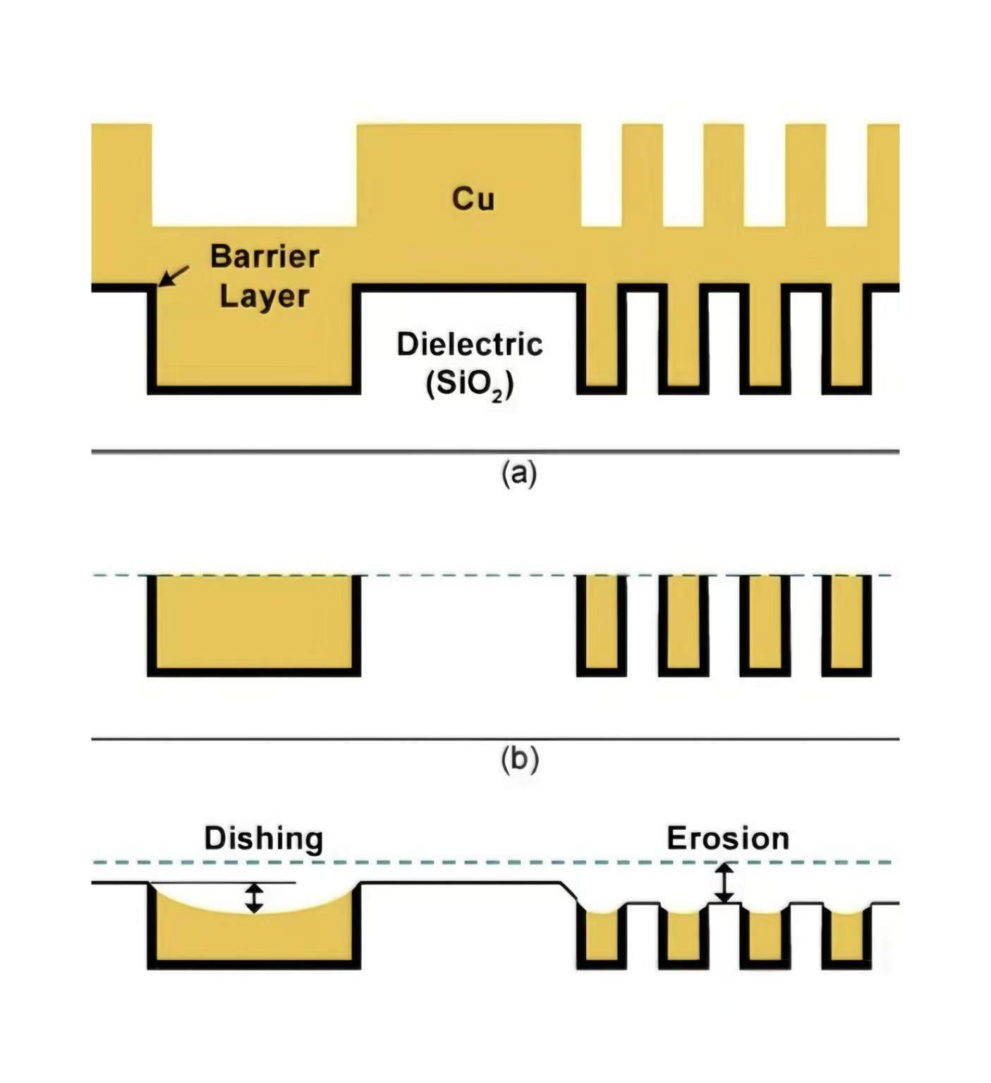 Kemiallinen mekaaninen kiillotus (CMP), jossa yhdistyvät kemiallinen korroosio ja mekaaninen kiillotus pinnan epätäydellisyyksien poistamiseksi, on merkittävä puolijohdeprosessi, jonka avulla saavutetaan koko pinnan tasoitus.vohvelipinta. CMP johtaa kahteen pintavirheeseen, kuoppaan ja eroosioon, jotka vaikuttavat merkittävästi liitosrakenteiden tasaisuuteen ja sähköiseen suorituskykyyn.
